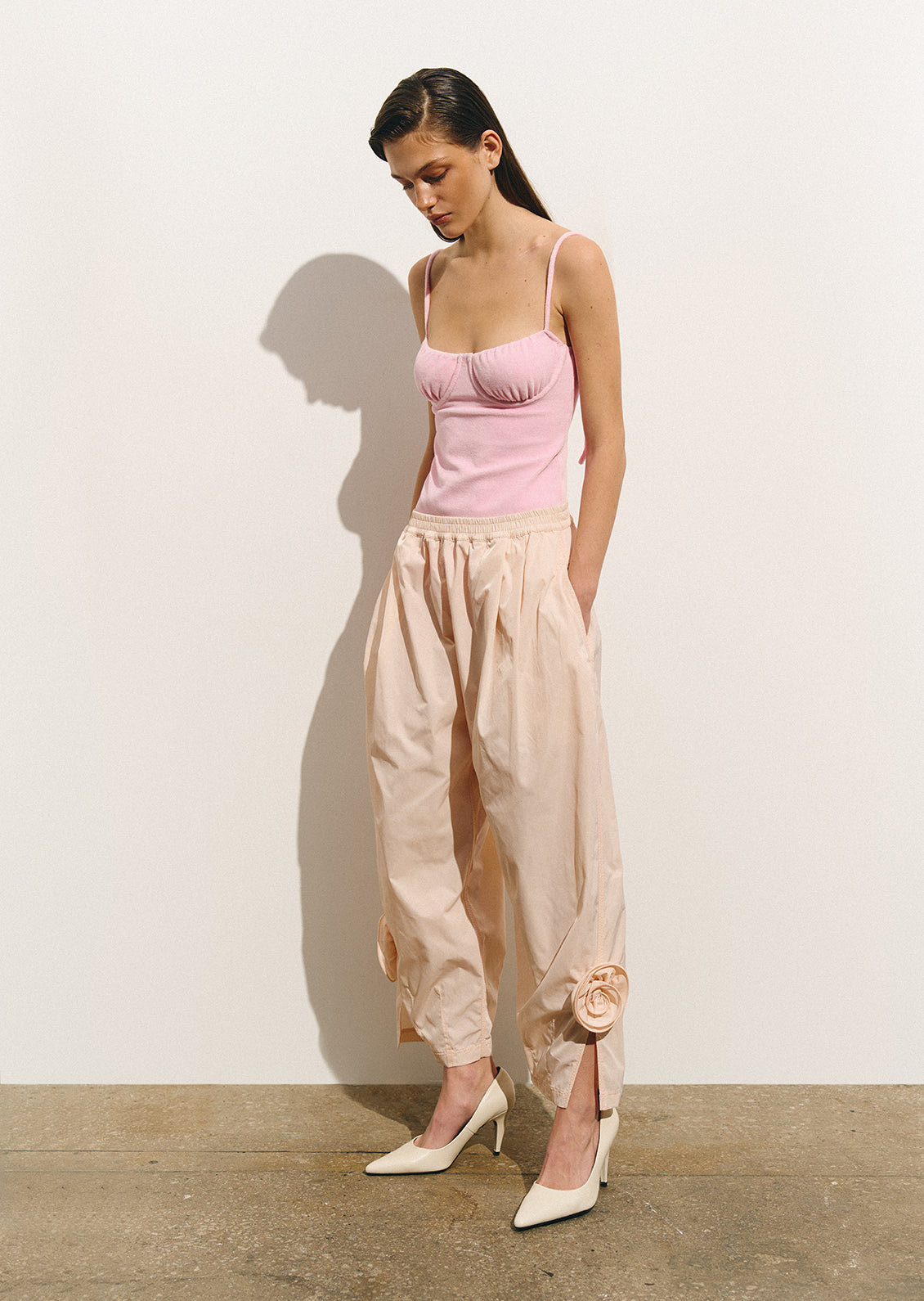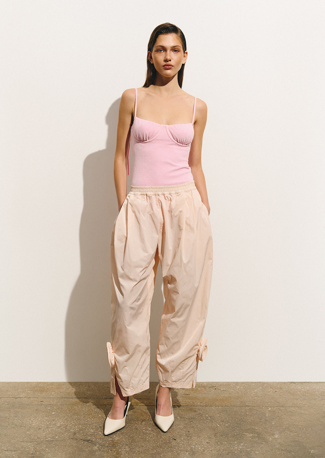 Боді виготовлене з двох шарів тканини: стрейчевого оксамиту та скульптуруючого біфлексу. Спеціальний крій ліфу з кісточками у поєднанні зі щільним матеріалом забезпечує м’яку фіксацію бюсту без зайвого дискомфорту. Бретелі регулюються по довжині зав’язками, що дозволяє легко адаптувати посадку. Елегантна й функціональна річ, яка поєднує комфорт та виразний силует.
