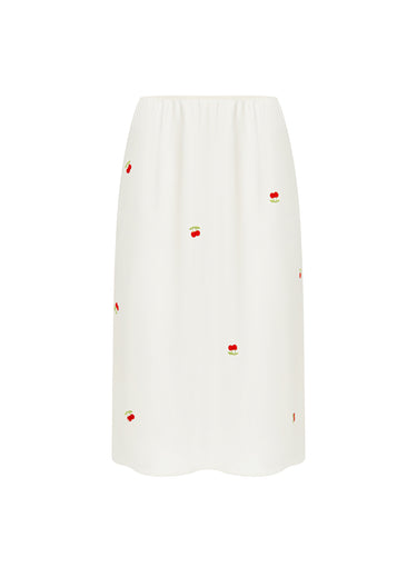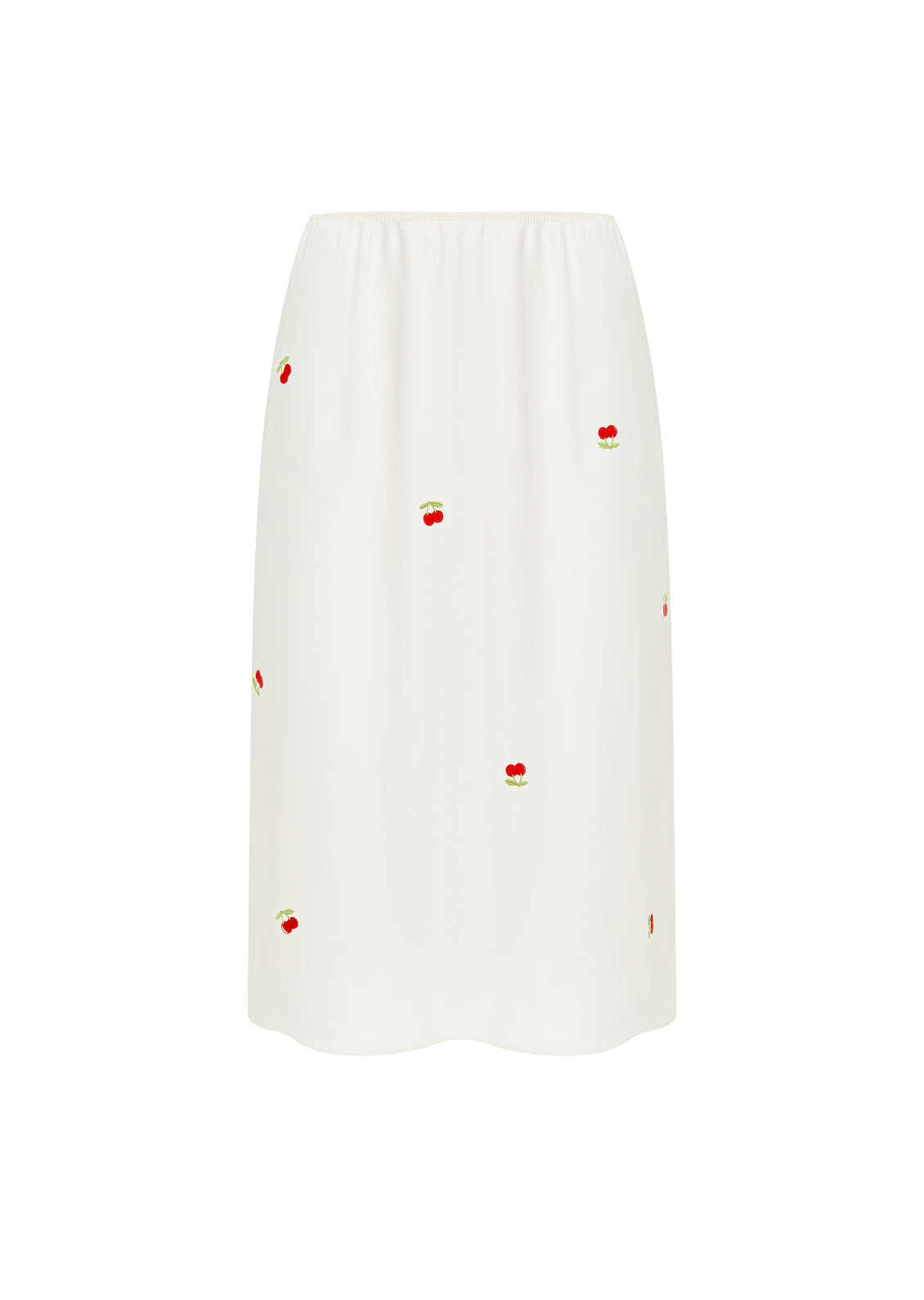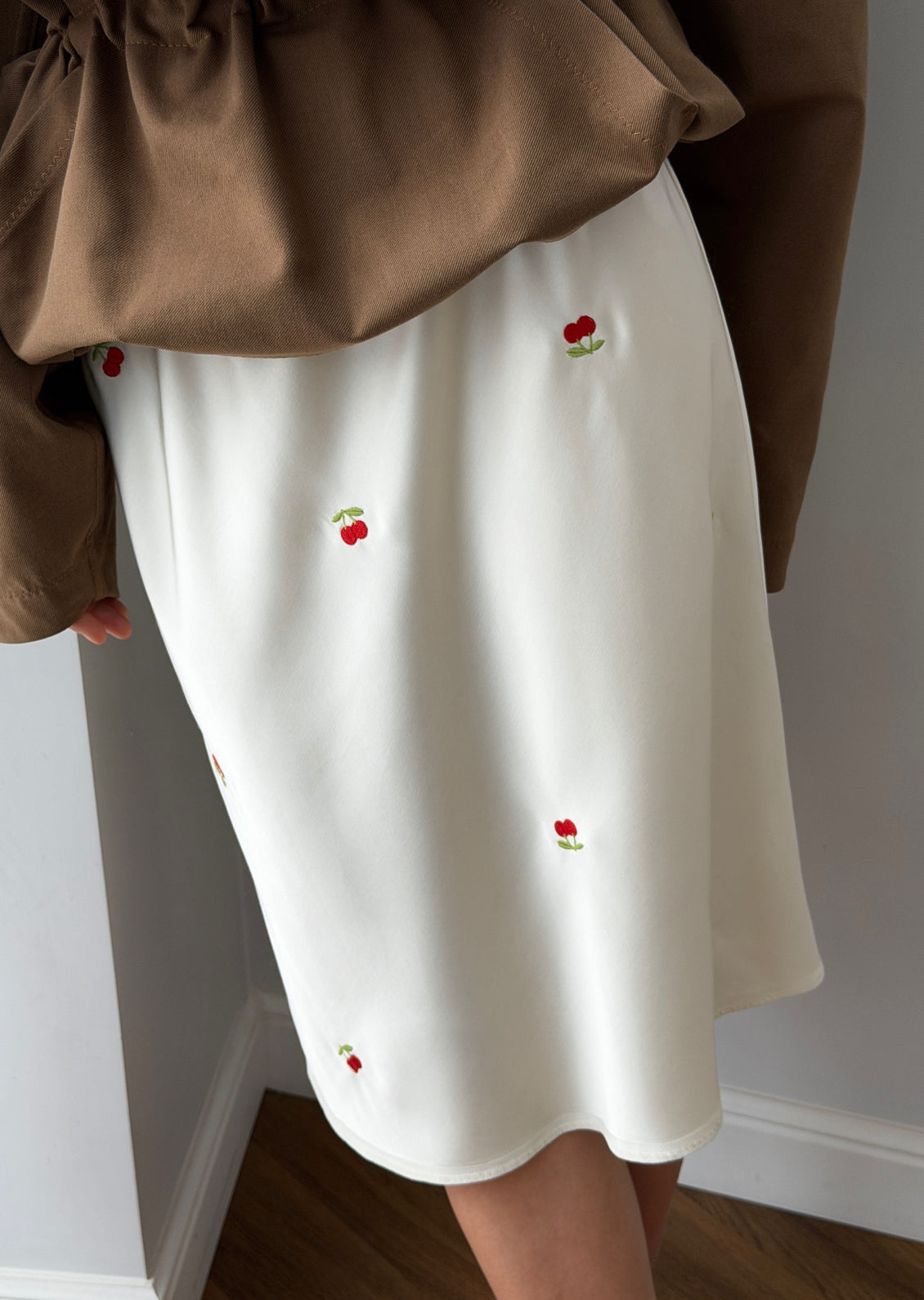 Спідниця міді з блискучого атласу, що м’яко драпірується. Декорована знаковою вишивкою CЇХ у вишеньки. Пояс на резинці забезпечує комфортну посадку.