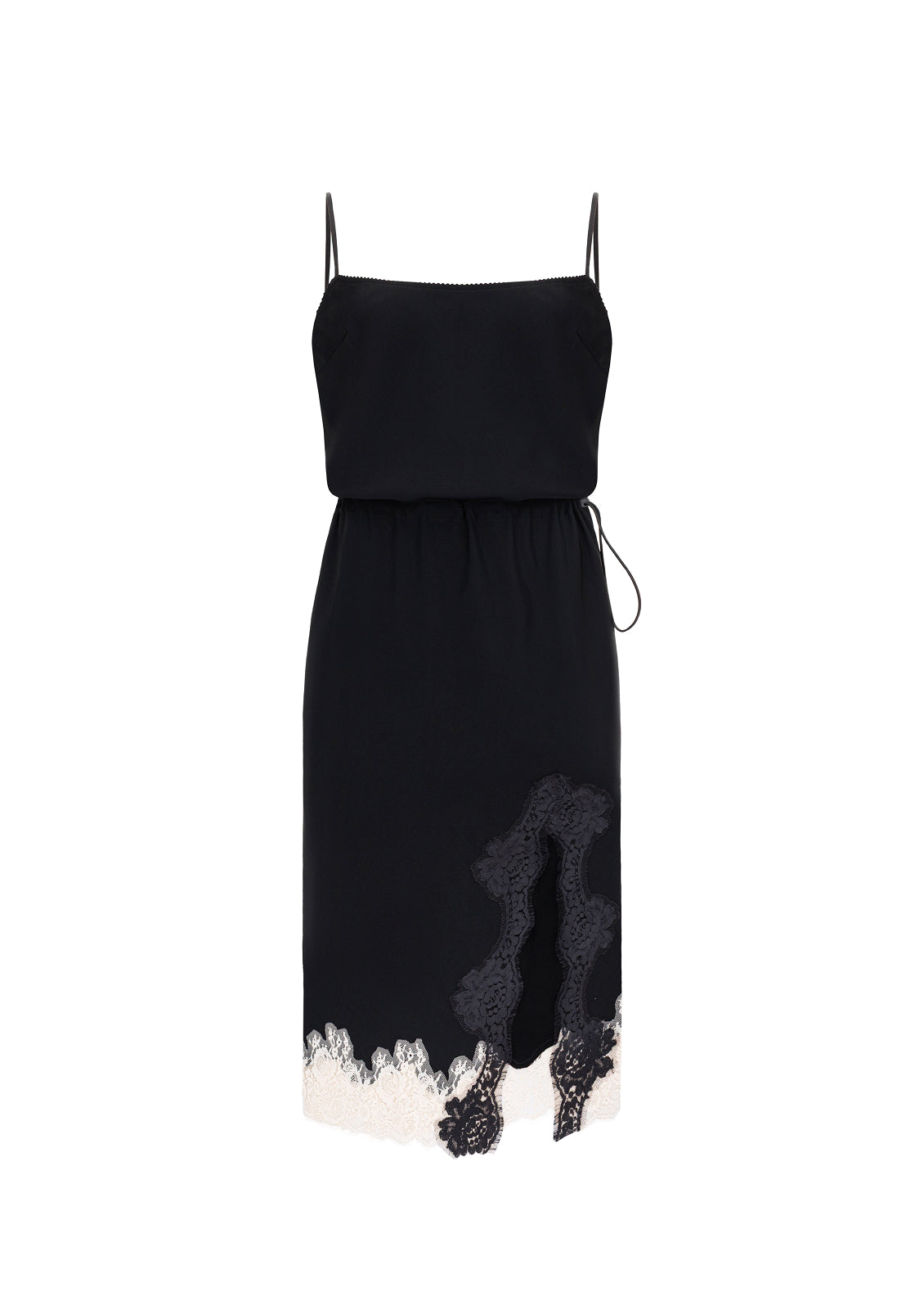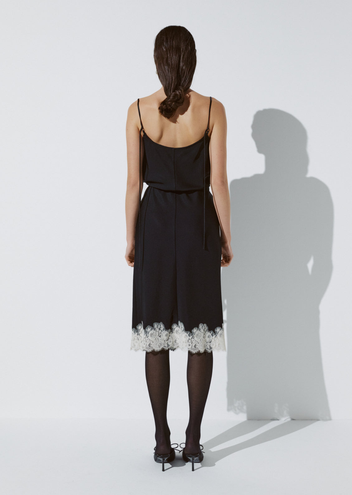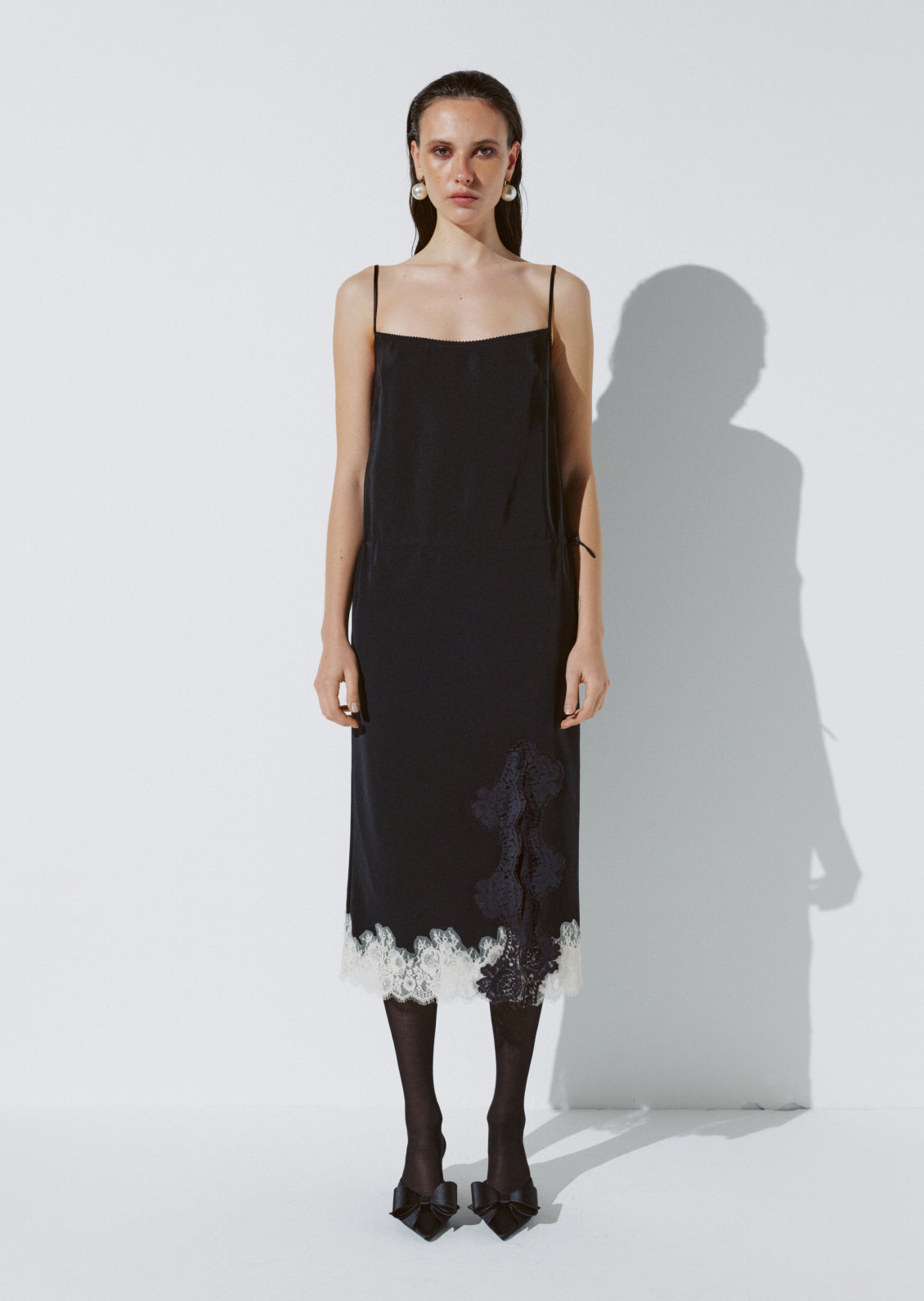 This lingerie-inspired dress is adorned with black and white lace and crafted from a soft, matte, fluid fabric that drapes beautifully. The bias cut allows it to naturally adapt to individual body measurements. The contrasting lace hem adds definition, while the adjustable waist drawstring offers versatility in shaping the silhouette. A stylish and universal piece, perfect for both daytime looks and evening occasions.