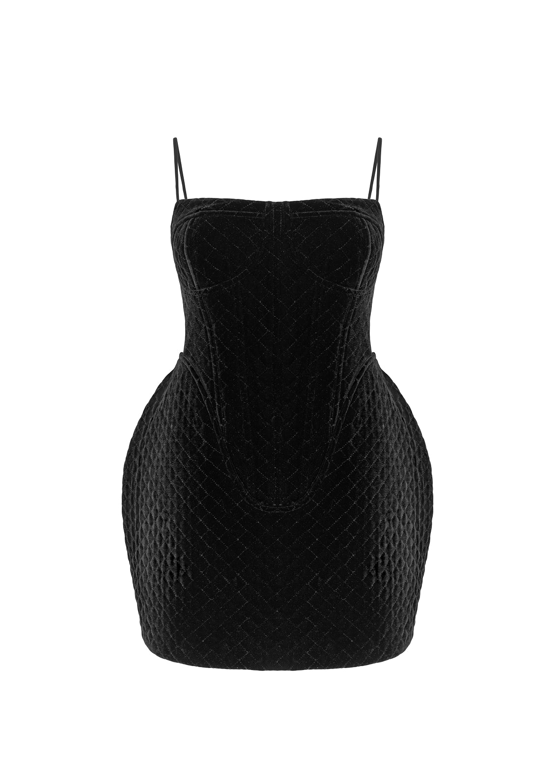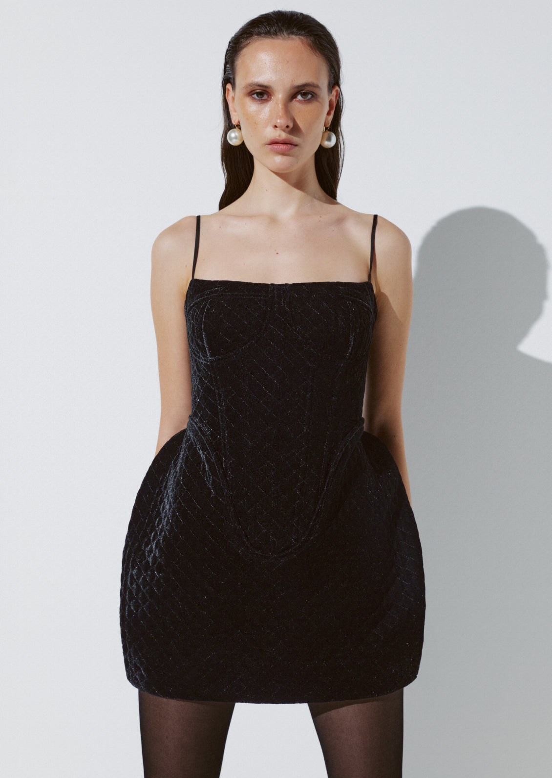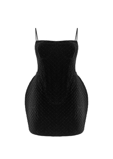 A mini dress crafted from CIX’s signature quilted dense velvet. The built-in structure shapes a refined, sculpted silhouette. The skirt features exaggerated voluminous side panels, adding an architectural touch characteristic of the brand and highlighting the distinctiveness of the piece.