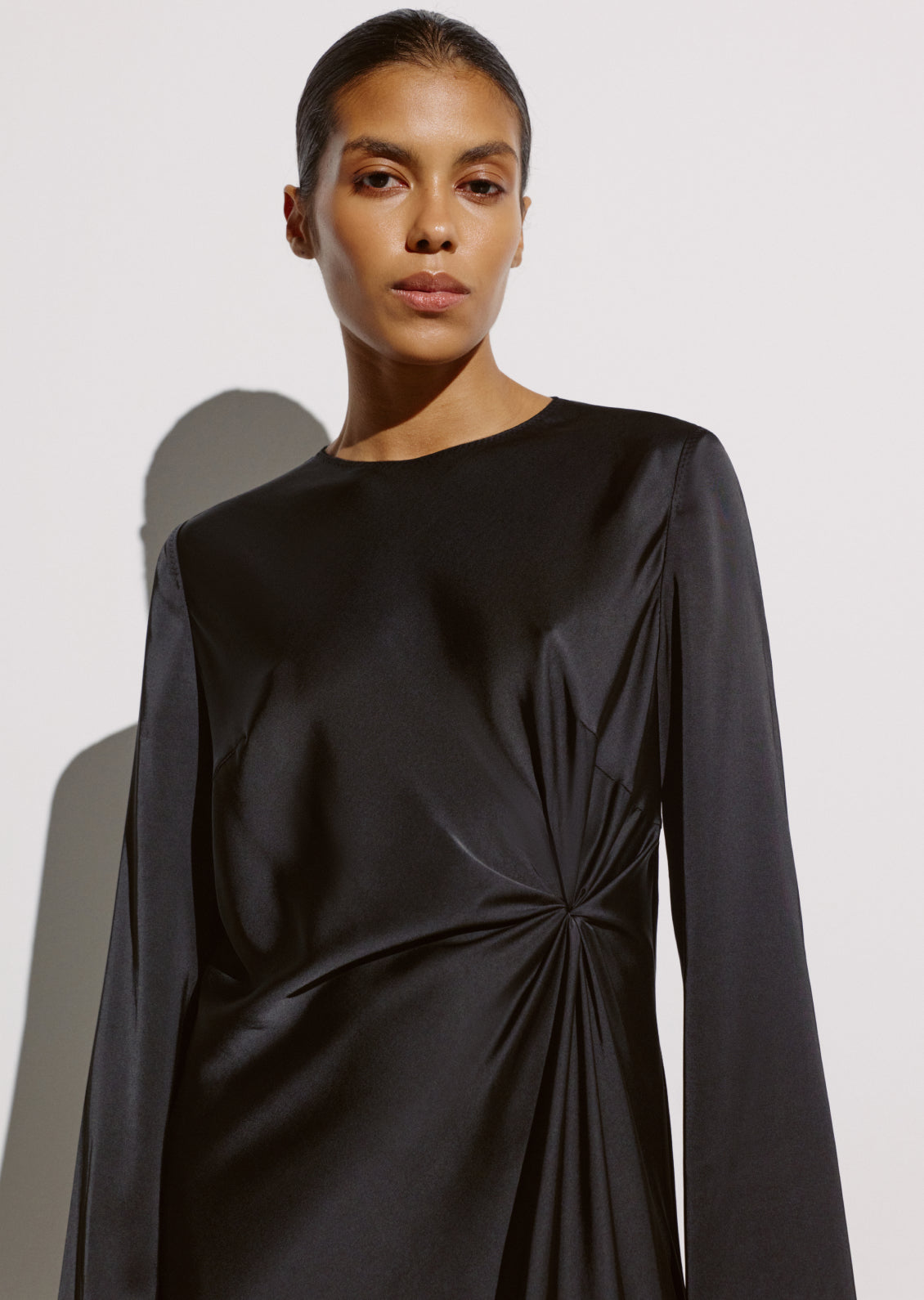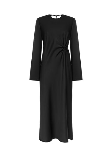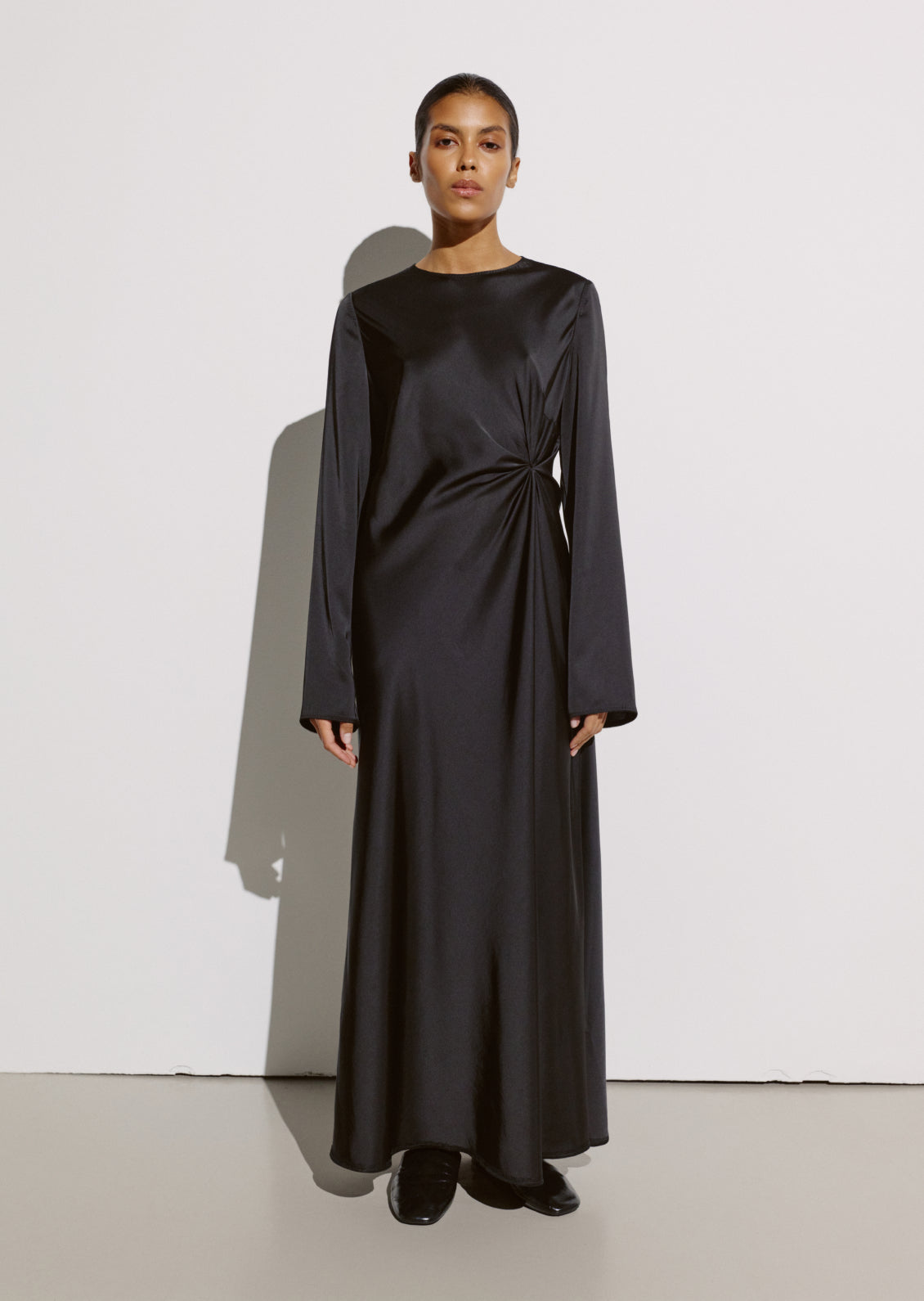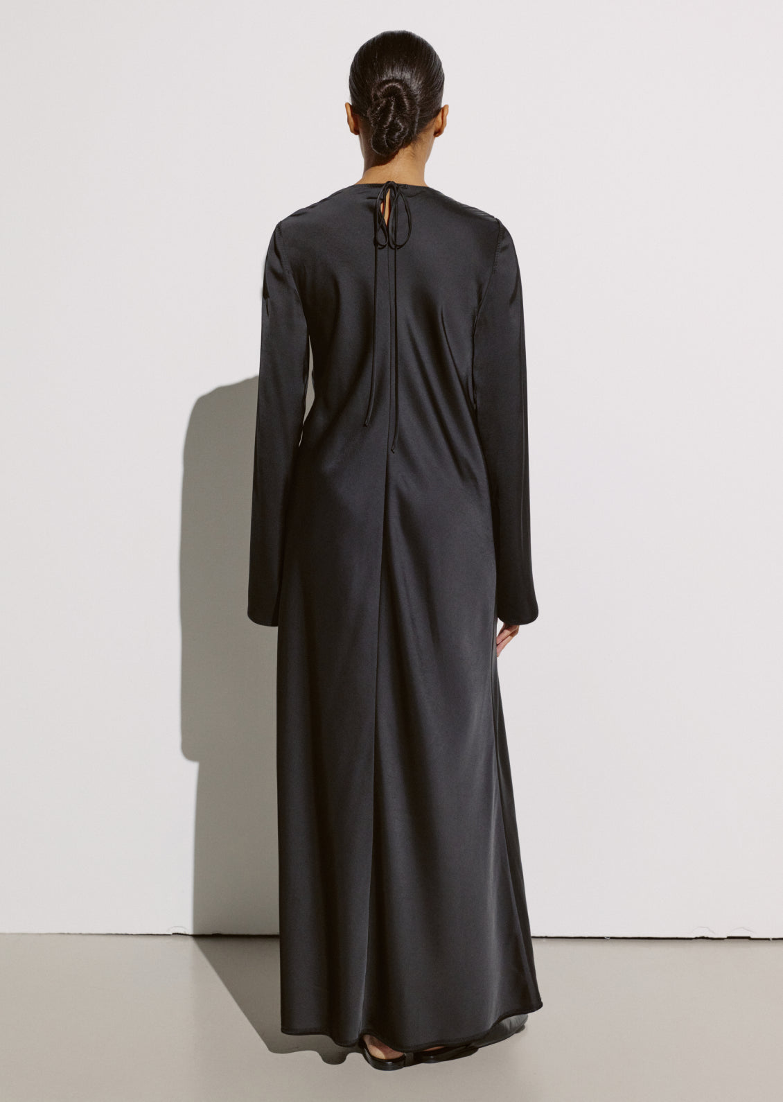 A maxi dress crafted from a silky-textured fabric that drapes softly and moves elegantly with the body. Cut on the bias, it offers a naturally flattering fit and easily adapts to individual measurements. The gathered detail is removable, allowing you to adjust the silhouette and shift the focus of the look. In the signature CIX aesthetic, the dress transitions effortlessly from daytime to evening styling while maintaining its refined, minimal elegance.