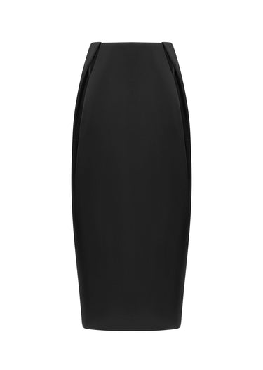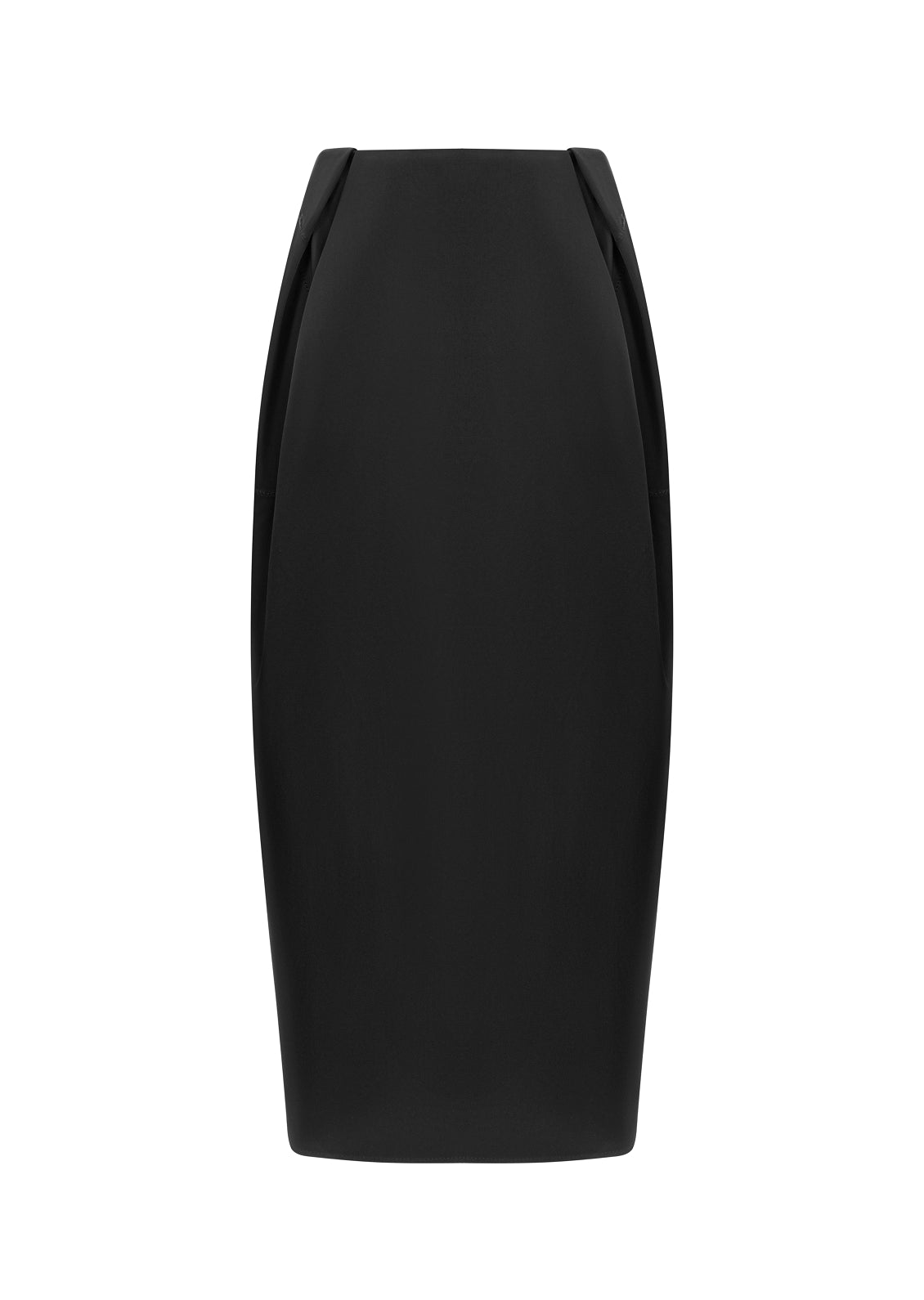 Skirt crafted from dense satin fabric that holds its shape and has no stretch. Designed with a low rise and a clean waistband line. The structured silhouette creates a defined, refined form. Fastened at the waistband. We recommend pairing it with CIX knit sweaters for a balanced look.