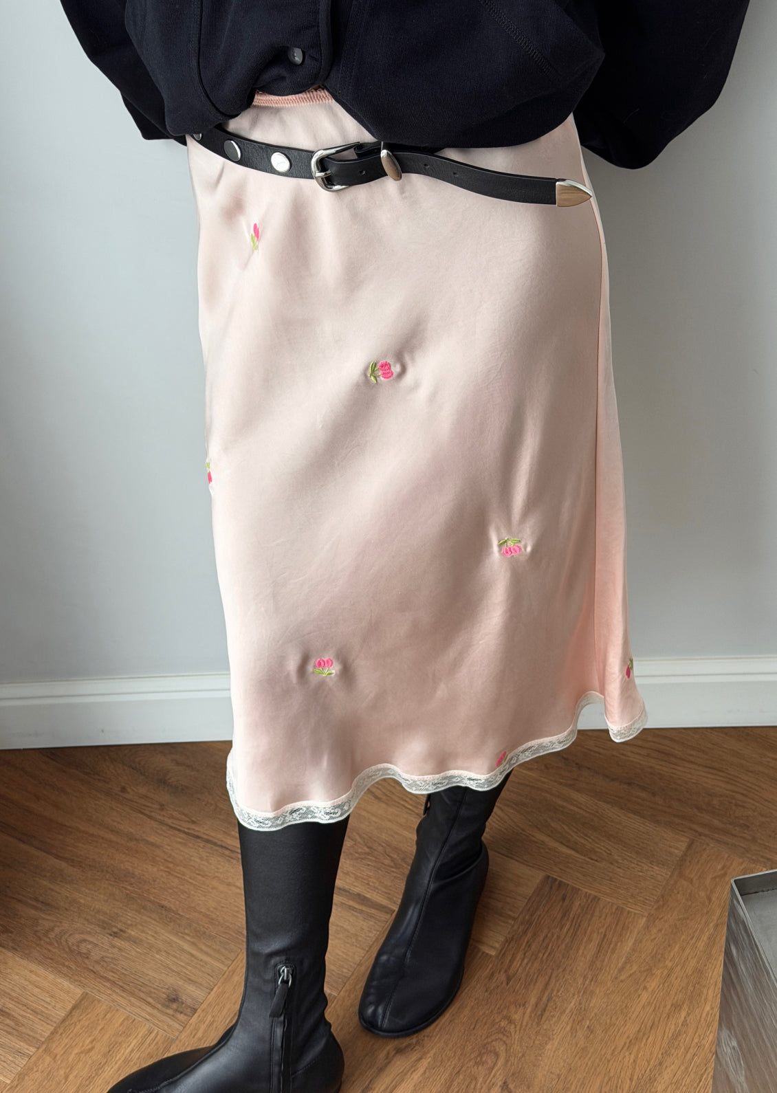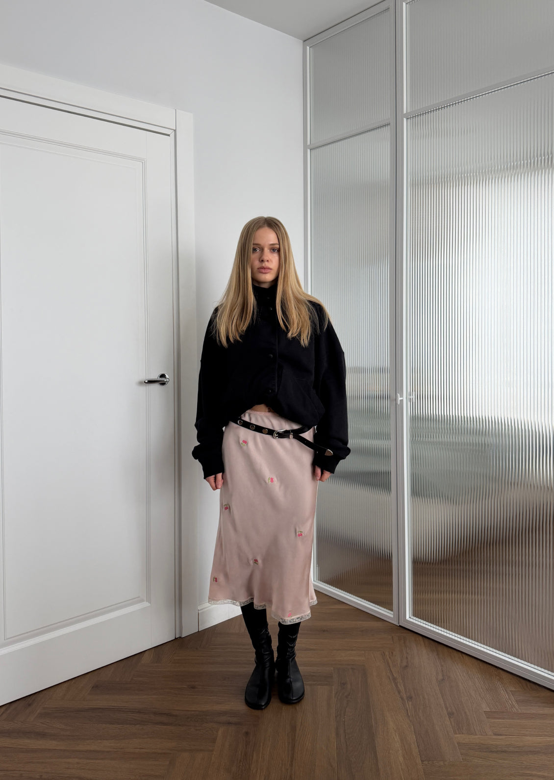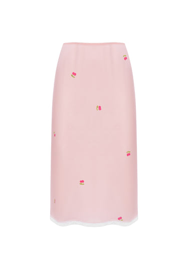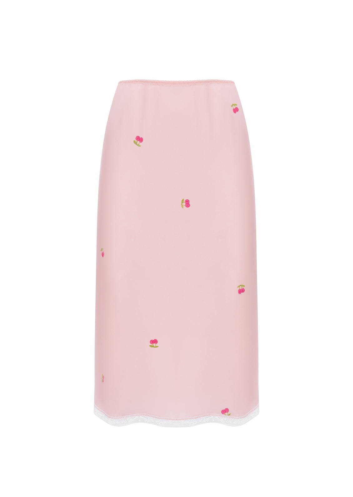Спідниця міді з тонкої шовковистої тканини з легким просвічуванням. Декорована знаковою вишивкою CЇХ у вишеньки та делікатним мереживом по низу. Пояс на резинці для гнучкої посадки. Рекомендуємо зберігати креш-ефект, прасування не потрібне.