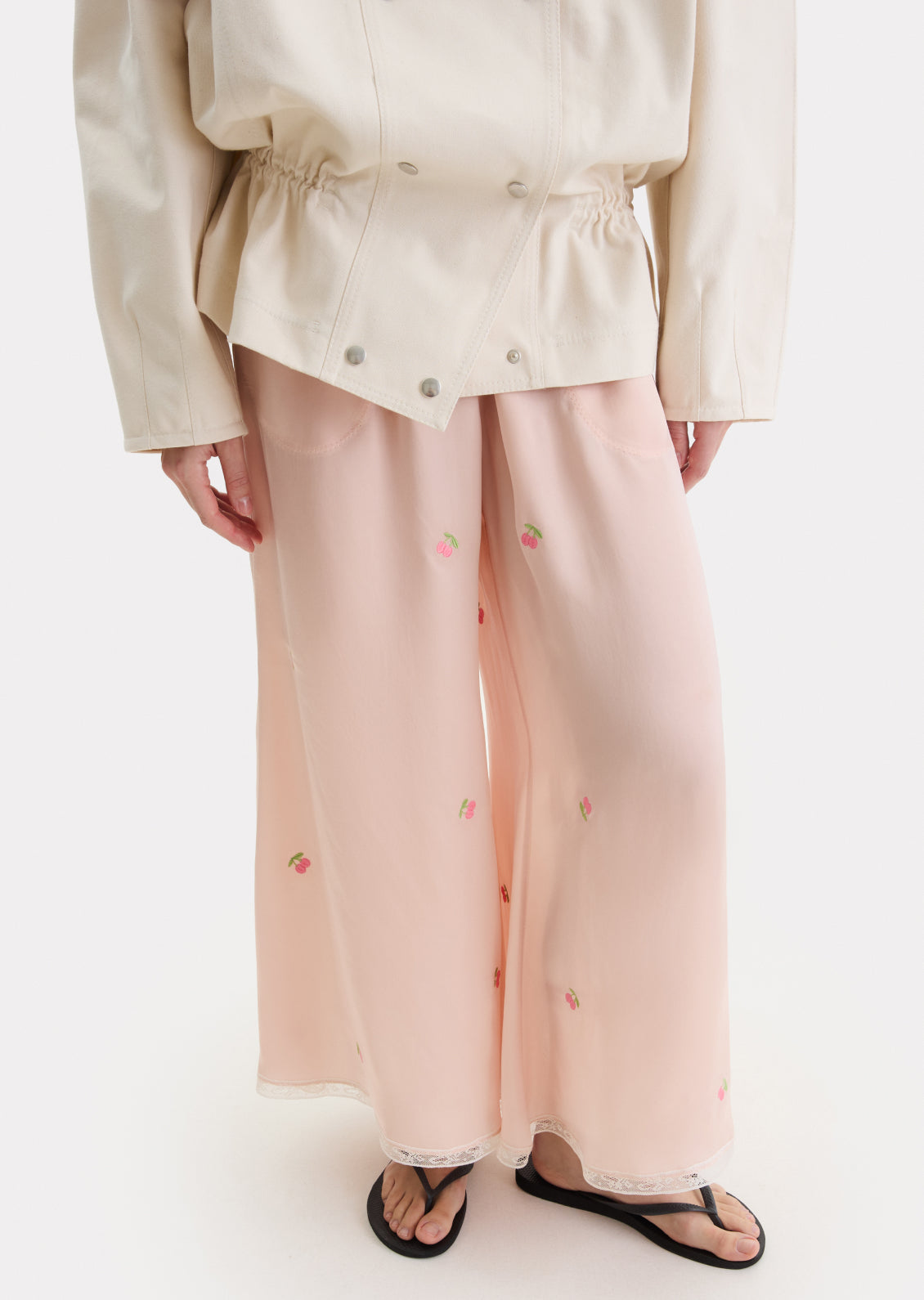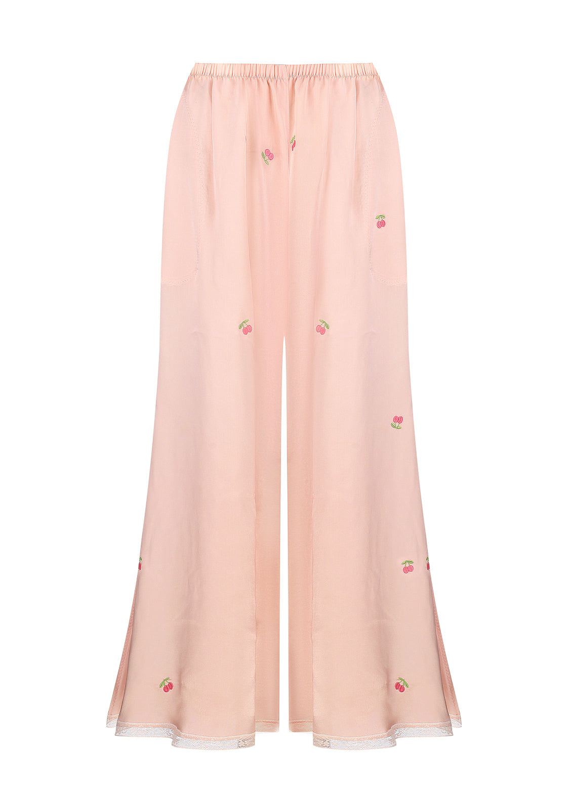 Штани вільного силуету, виконані з тонкої шовковистої тканини з легким просвічуванням. Модель декорована знаковою вишивкою CЇХ у вишеньки та делікатним мереживом по низу. Пояс на резинці забезпечує гнучку та комфортну посадку. Рекомендуємо зберігати креш-ефект — прасування не потрібне.