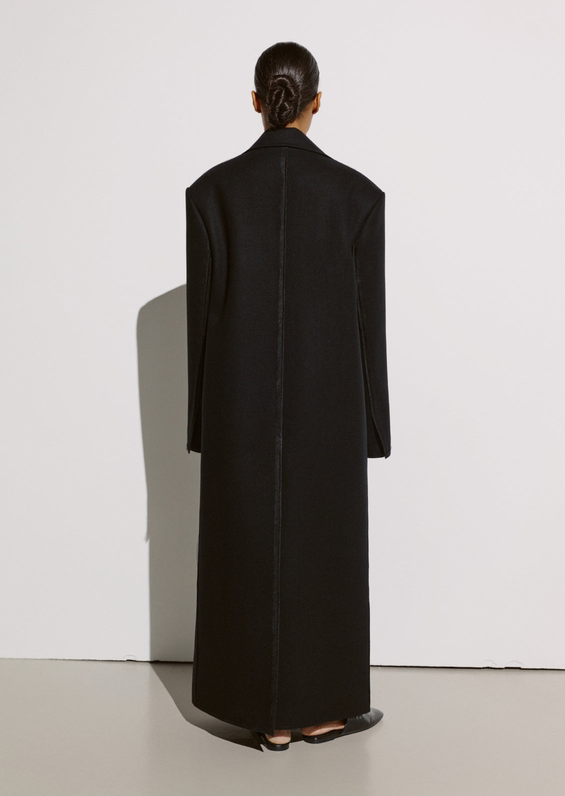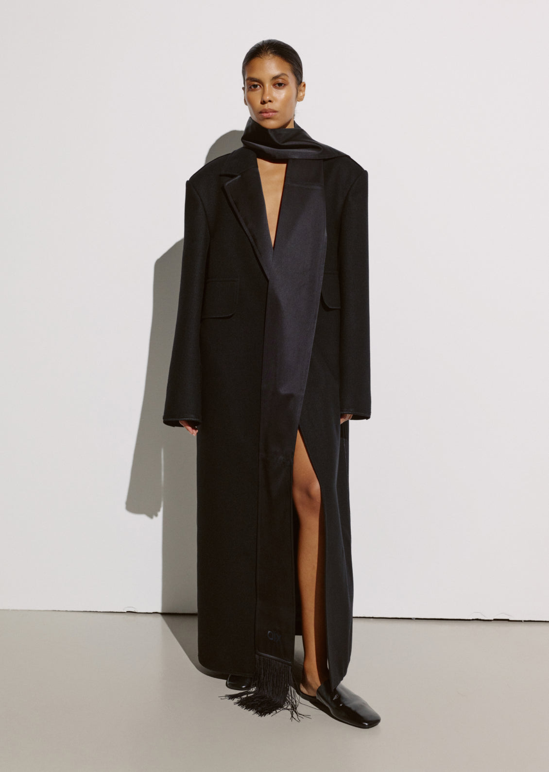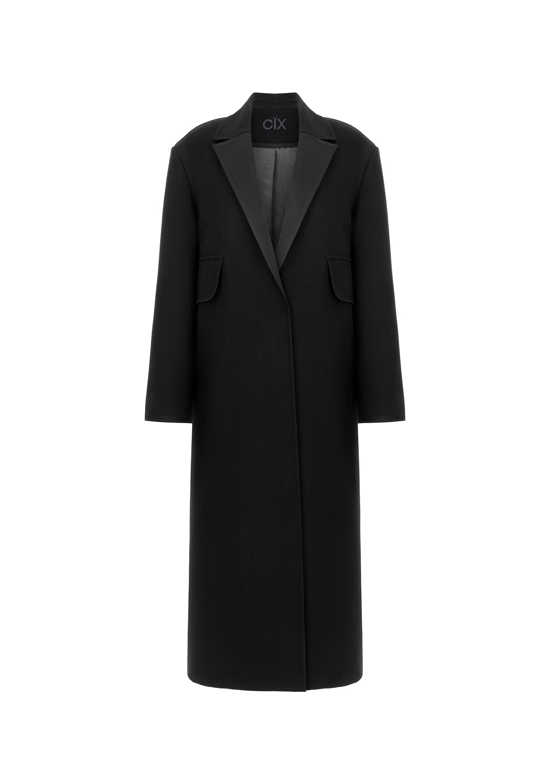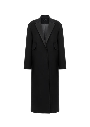 Пальто виготовлене зі щільної тканини, що тримає форму, на підкладці. Зшите за спеціальною технологією CIX — обробки та з’єднання швів через дедерон, що забезпечує ідеальну конструкцію виробу. Модель має виразний акцент на лінії плечей. Рекомендуємо стилізувати зі шарфом-поясом із бахромою CIX.