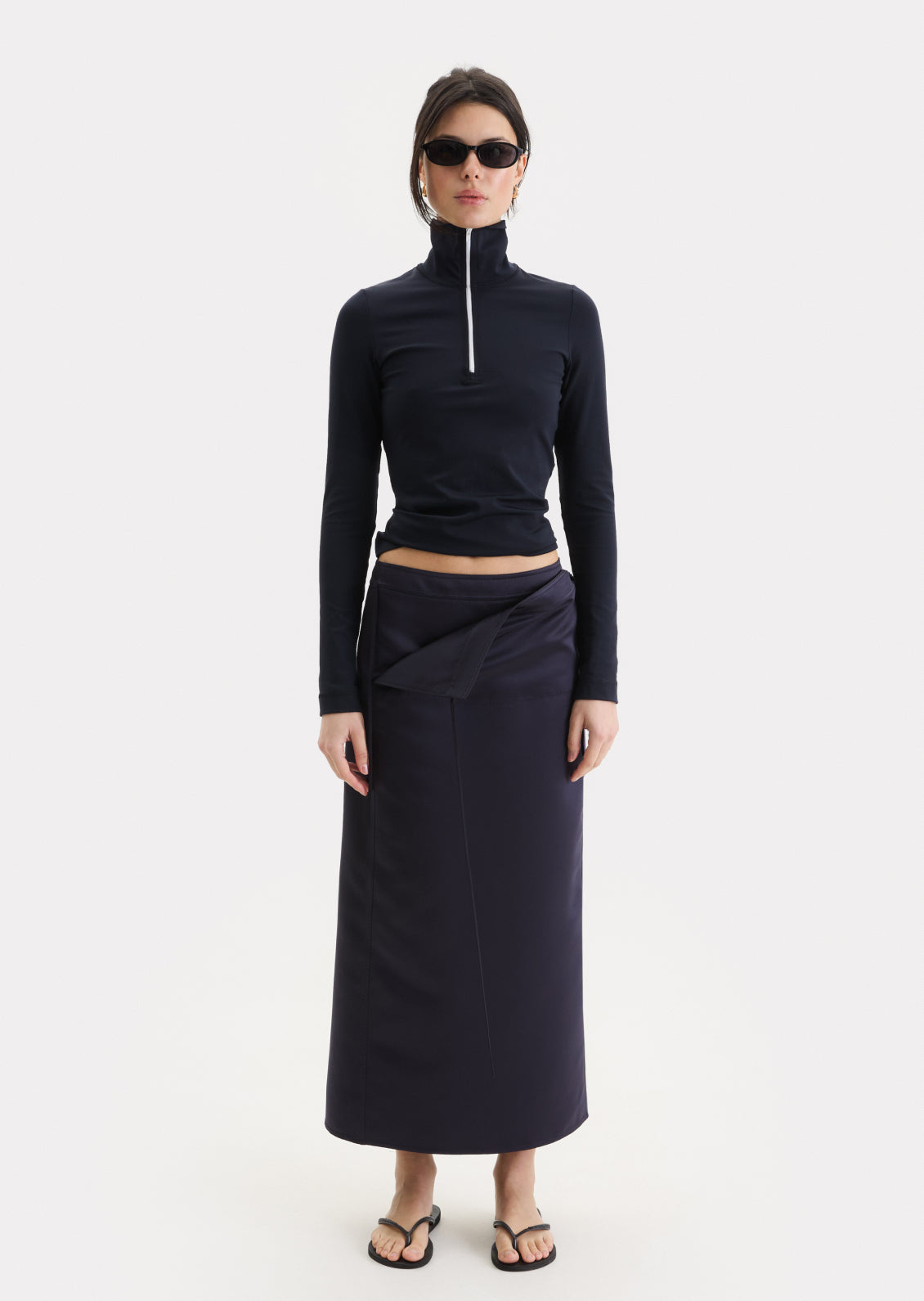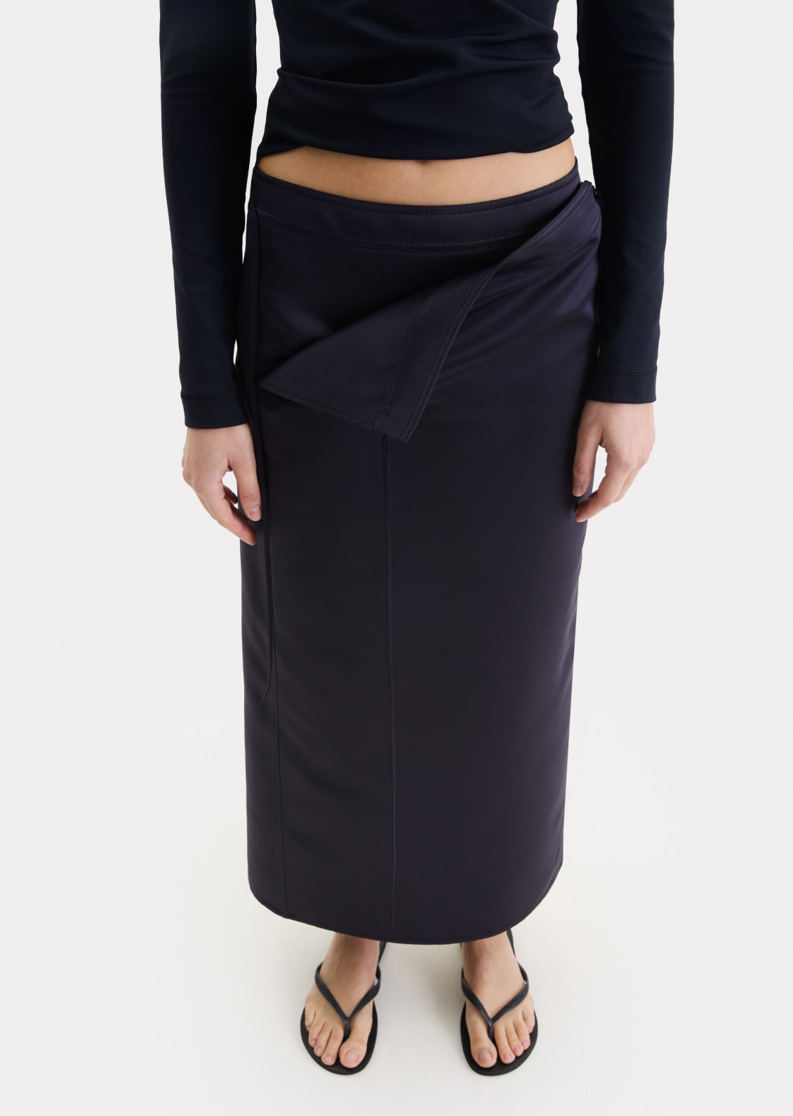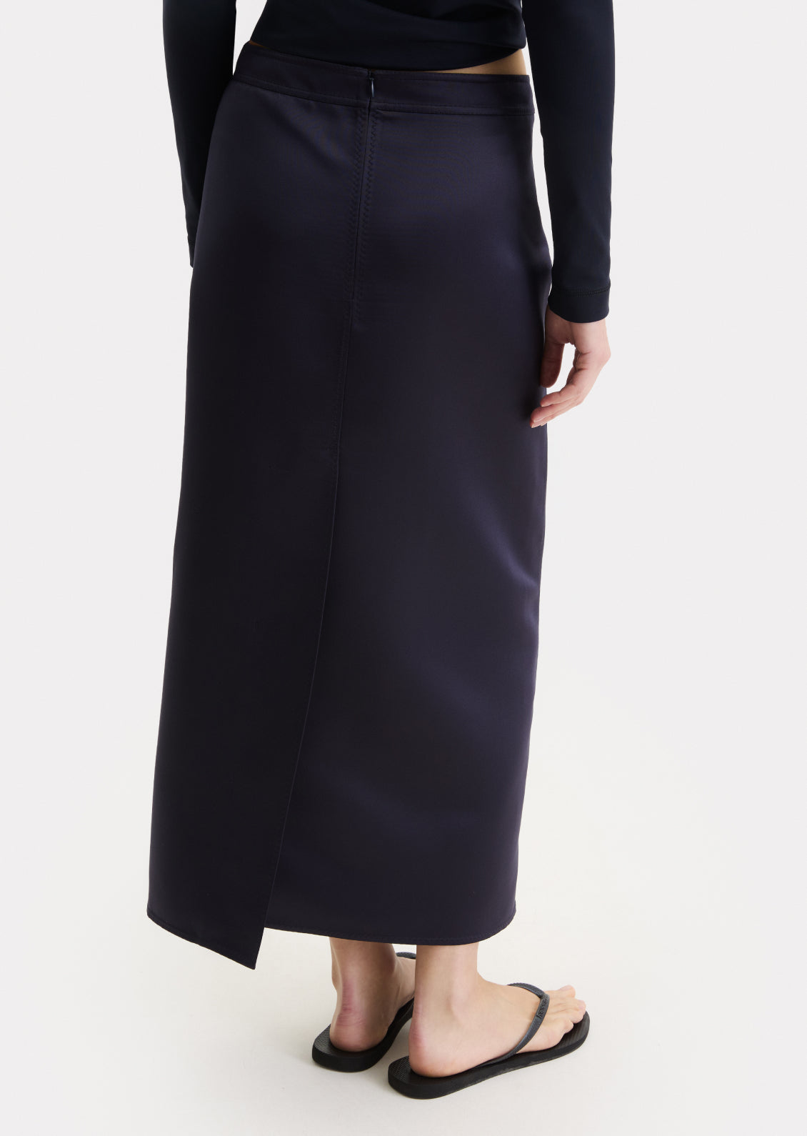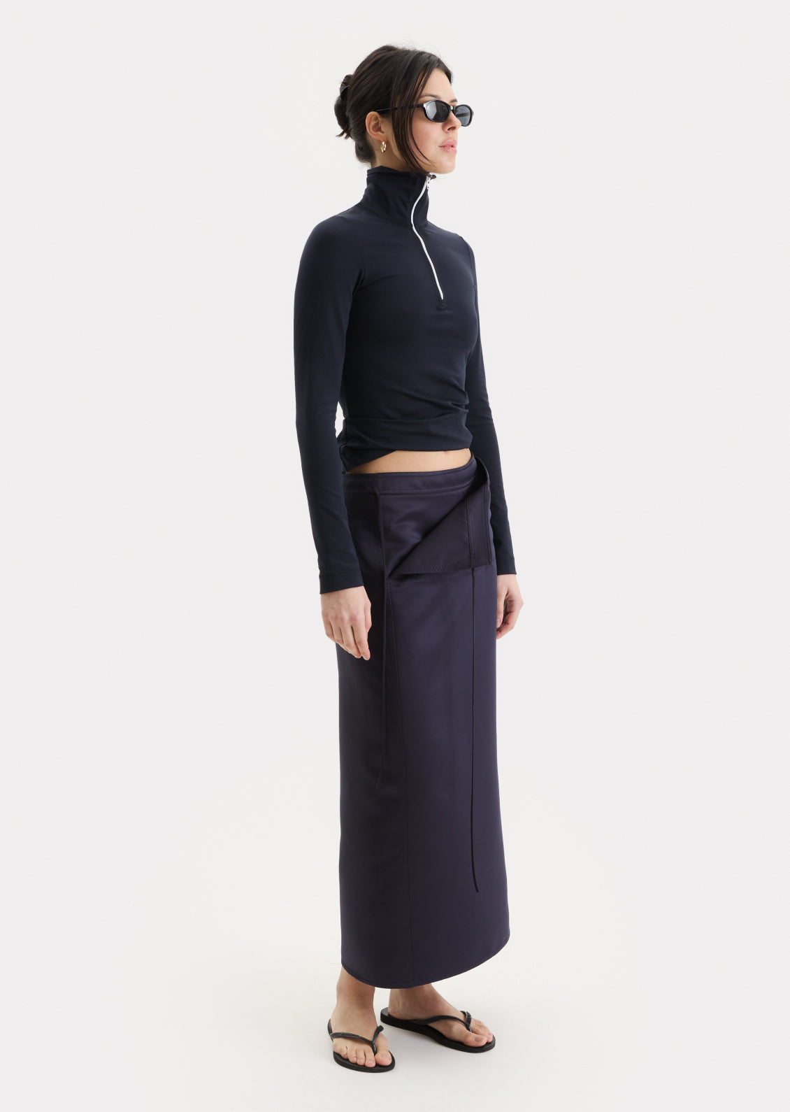 Тонка щільна тканина без еластичності, що добре тримає форму. Низька посадка та застібка. Відлітна кокетка на зав’язках дозволяє змінювати силует і варіанти стилізації. Лаконічний крій, що залишається актуальним поза часом.