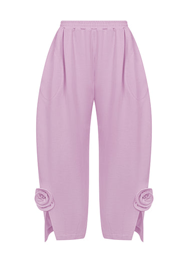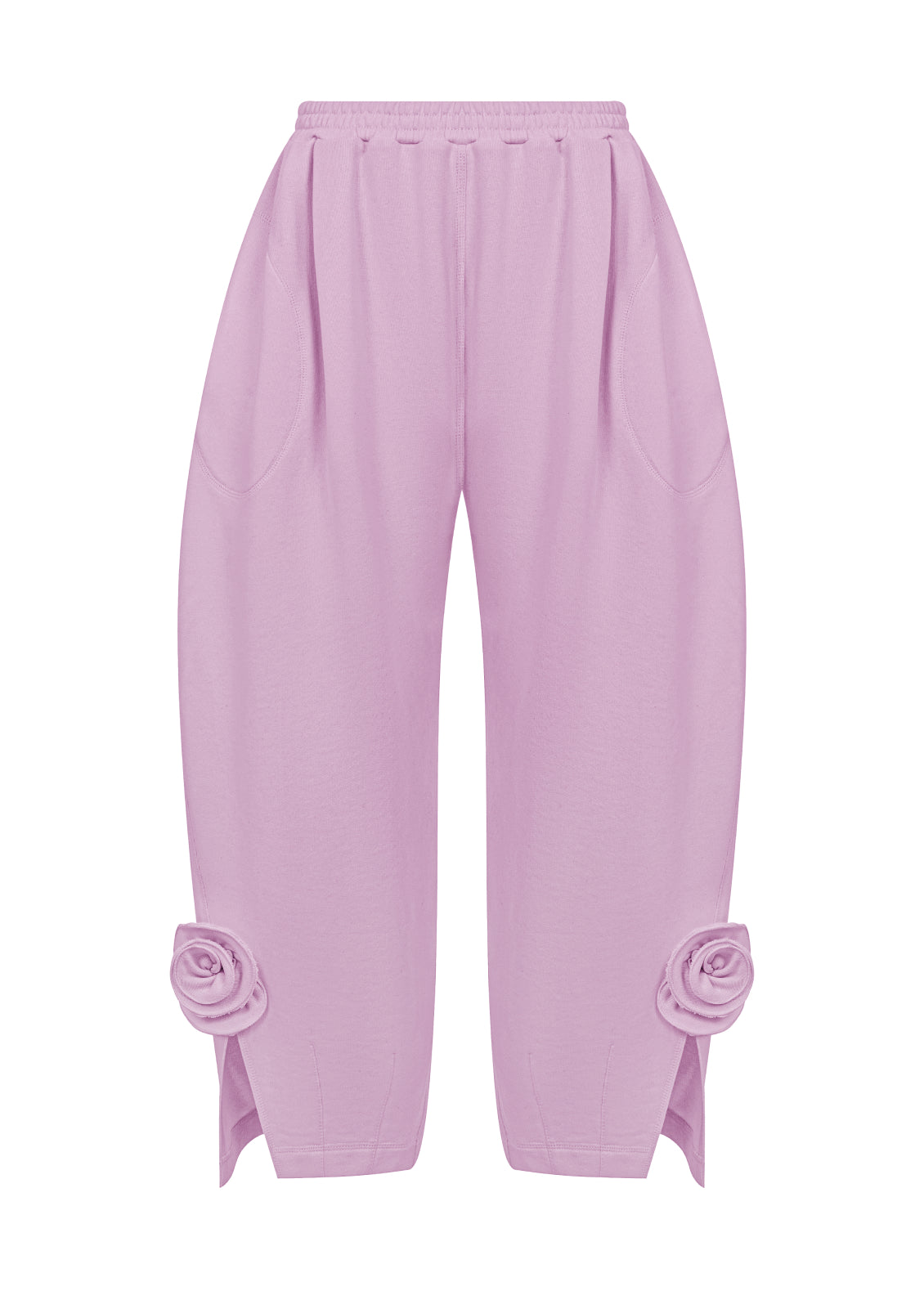Штани виготовлені з щільного heavy cotton, що добре тримає форму та зберігає комфорт у носінні. Пошиті в трьох універсальних розмірах, мають гумку на талії для гнучкої та зручної посадки. Заокруглений крій створює особливий силует, а понизу штани декоровані знаковими квітами СЇХ — характерною деталлю бренду.