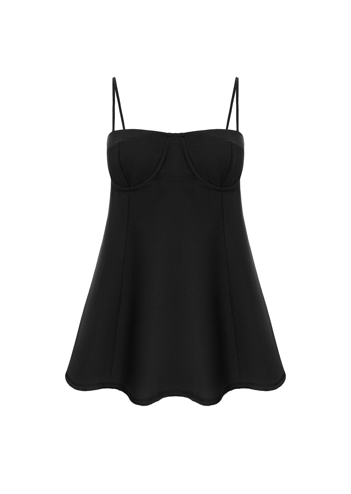Топ виготовлений з тонкої, комфортної вовняної тканини. Завдяки спеціальному крою ліфу з кісточками та щільній структурі матеріалу забезпечує м’яку фіксацію бюсту без зайвого дискомфорту. Бретелі регулюються зав’язками для індивідуальної посадки.