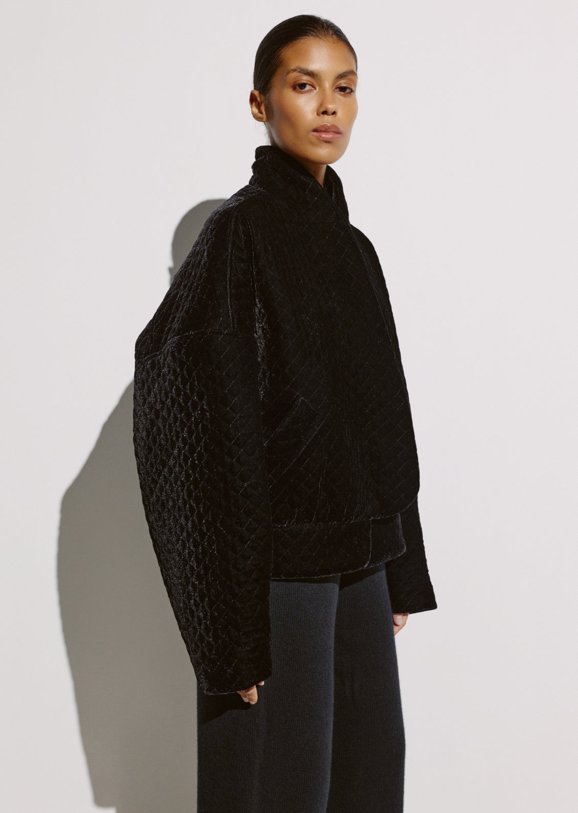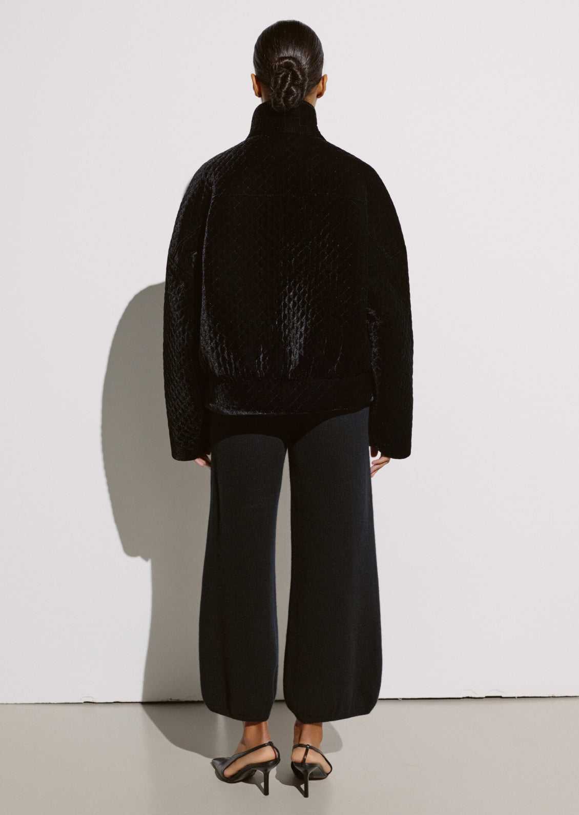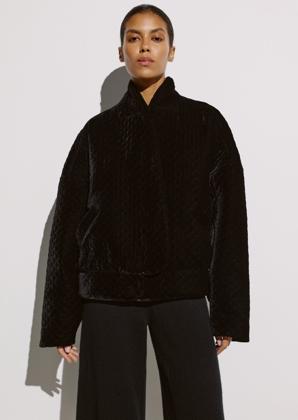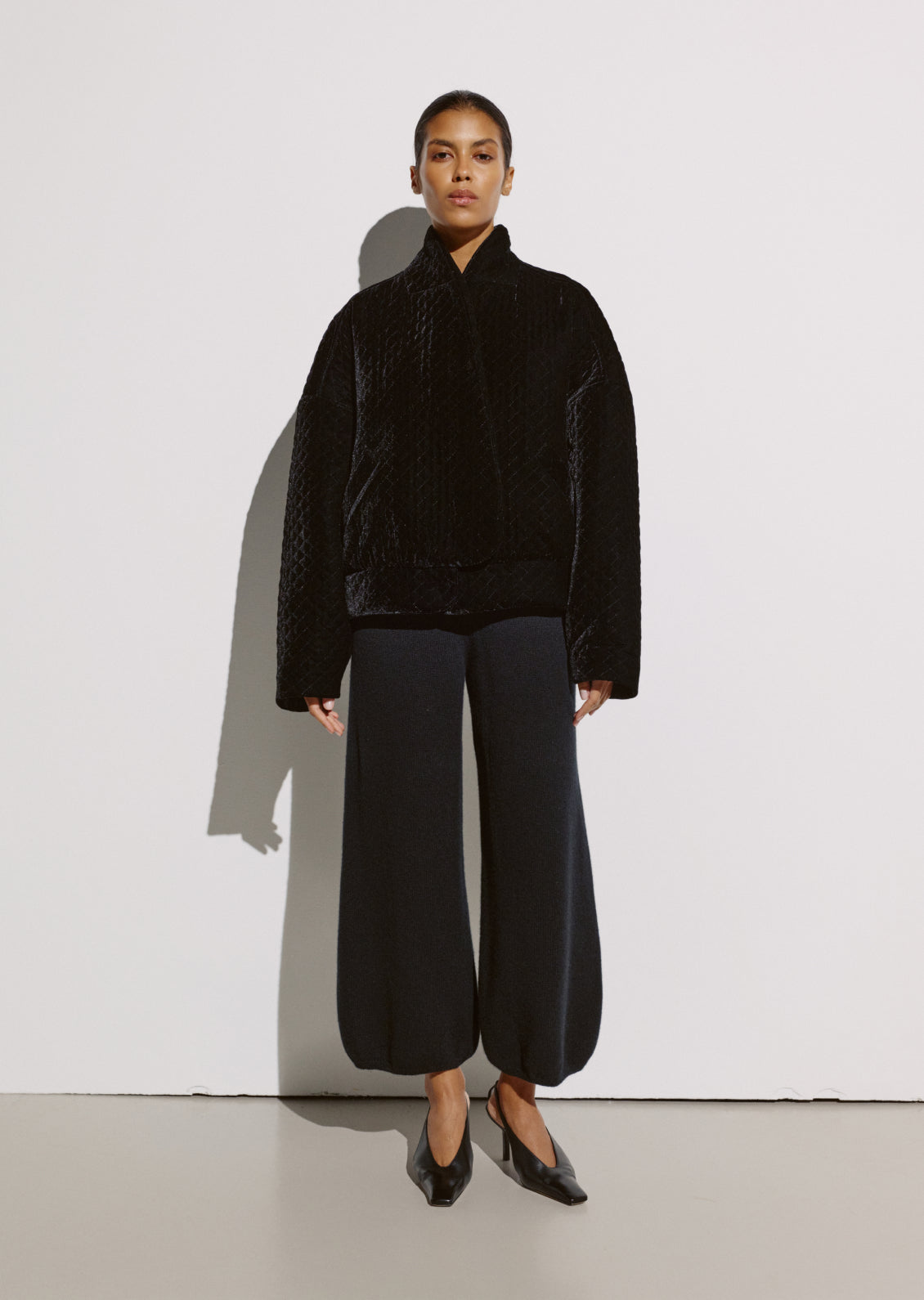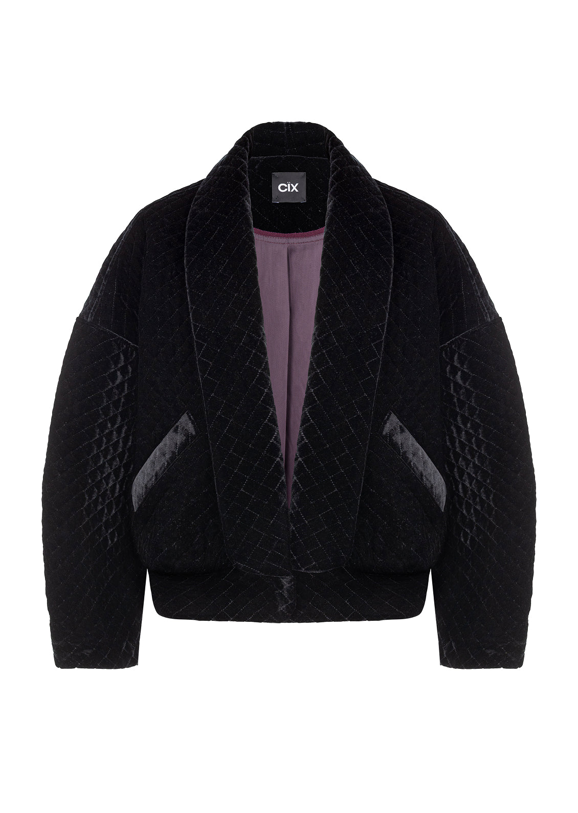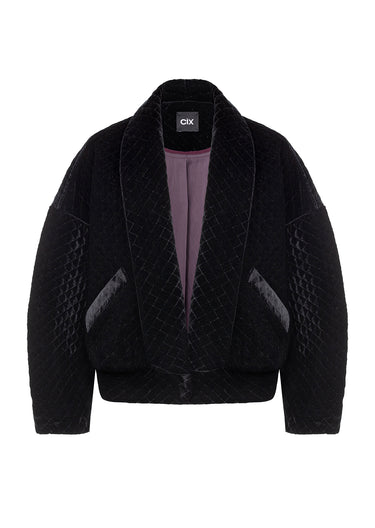 Фірмовий стьобаний оксамит, впізнаваний елемент колекцій CIX, цього сезону отримав нове прочитання в дусі 80-х. Укорочений жакет із акцентом на лінії плечей формує чіткий, структурований силует. Завдяки знімним підплічникам його можна легко трансформувати — від виразного та графічного образу до м’якшого, розслабленого.